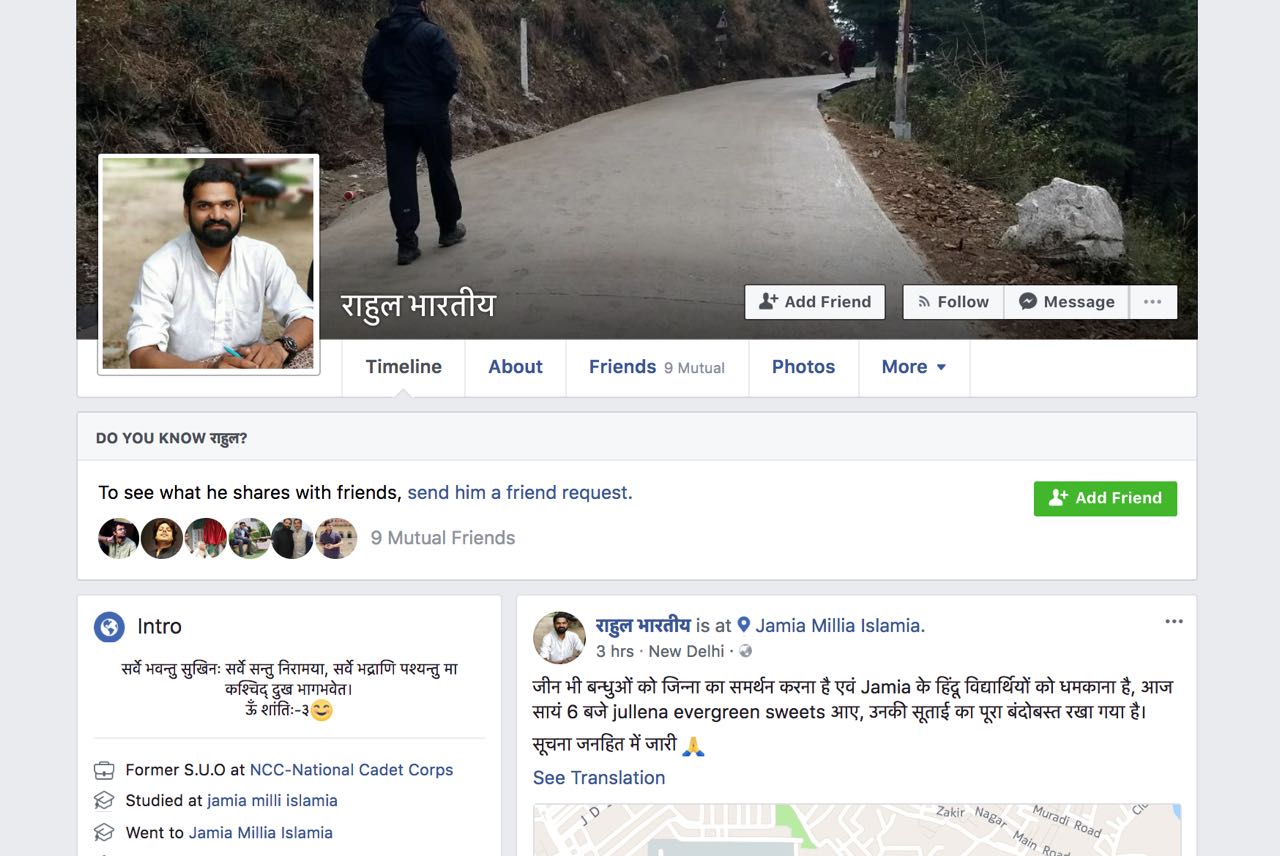 Students at Jamia are visibly upset about this rhetoric, and have demanded strict action against the rabble-rousers at this march, many of whom are believed to be outsiders and not students of the university. This reporter was able to access a screenshot of a social media post written by Tiwari, who goes by the name of Rahul Bharatiya on Facebook. It quotes him as saying, "Jin bhi bandhuon ko Jinnah ka samarthan karna hai evam Jamia ke Hindu vidyarthiyon ko dhamkana hai, aaj shaam 6 baje Jullena Evergreen Sweets aaye, unki sutayi ka poora bandobast rakha gaya hai (Brothers who want to support Jinnah and intimidate Hindu students at Jamia, come to Jullena Evergreen Sweets at 6 this evening, full arrangements have been made to beat you up)."