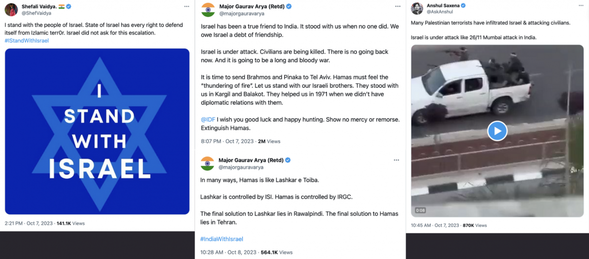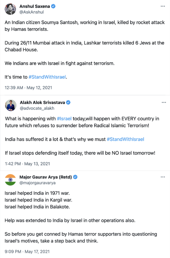 “We Indians are with Israel in fight against terrorism. It's time to #StandWithIsrael,” Anshul Saxena, a prominent right-wing voice on X, had posted on May 12, 2021.