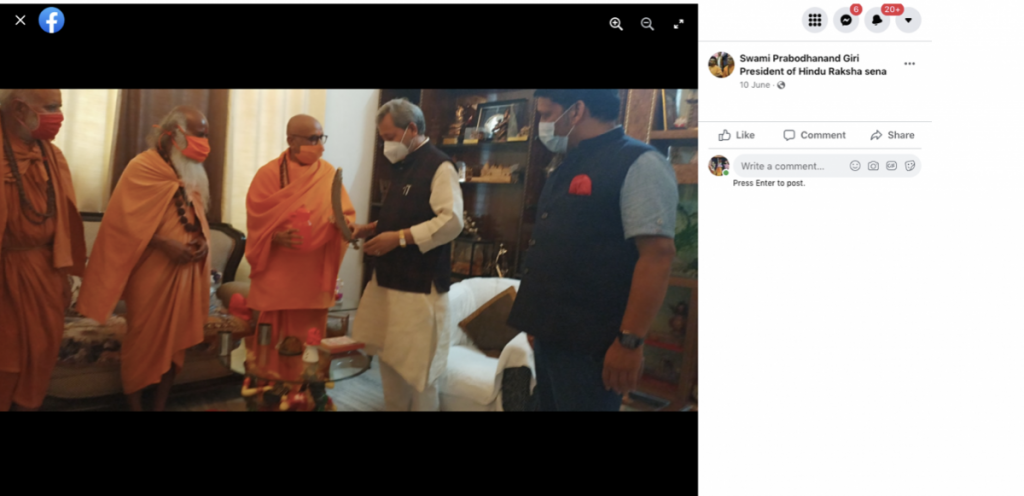 In June 2021, he was also photographed with former Uttarakhand CM and BJP member Tirath Singh Rawat, giving him a sword.