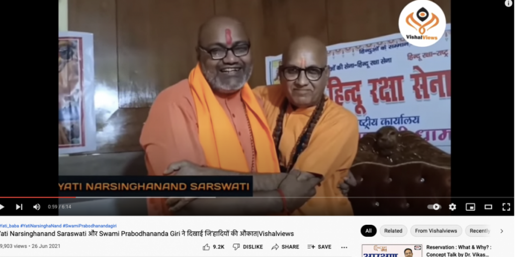 He has also made genocidal statements in a video with Yati Narsinghanand Saraswati that was made public in June of this year. In that video, he says, “In the entire world, if we want humanity to last, we will need to clean it of jihadis. There should be treatment, management for jihadis on this earth. A few days ago someone said that in Islam, rapists are born, jihadis are born – I have been saying this for some time, there is a jihadi and a terrorist in each Islamic home… Hindu society needs to stand up and find a cure for jihadis, otherwise these jihadis will find a cure for Hindus, and there will be no place on this earth for us to live… One thing is certain, if he comes into my space and I find out, he will not leave. I have lived for 14 years among jihadis, I’m not that weak… They should not think that if Narsinghanand or I are killed, you can live happily. There will be a pile of corpses, across the country you will see corpses. This is certain, nobody will stop us.”