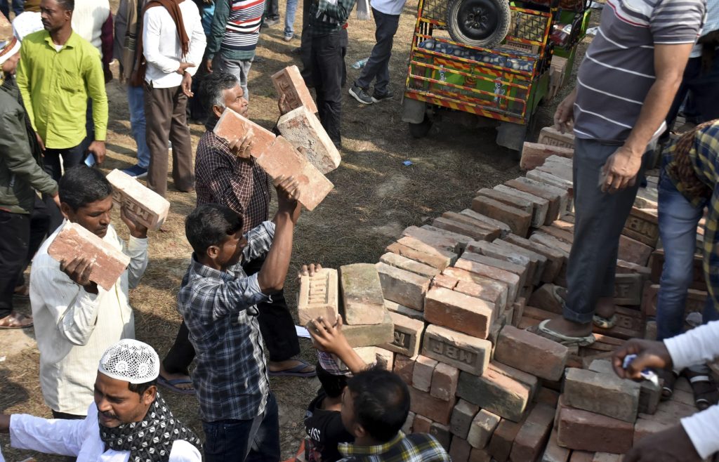 People carry bricks in view of former TMC MLA Humayun Kabir's plan to lay the foundation stone for a mosque, modelled on Ayodhya's Babri Masjid, at Rejinagar in West Bengal's Murshidabad district, Saturday, Dec. 6, 2025. Photo: PTI.