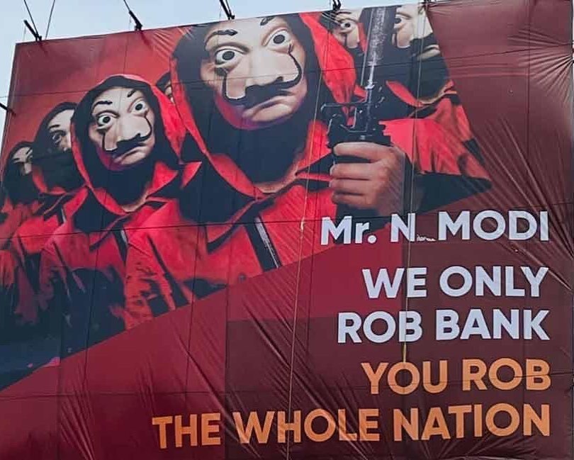 A poster targeting Prime Minister Modi in Hyderabad inspired by Netflix series 'Money Heist'. Photo: Twitter/ journopranav