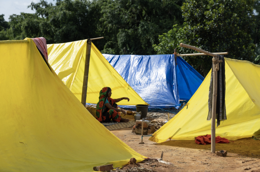 A woman cooks surrounded by tarpaulin tents in Chauabakhra. Photo: Kazi Sharowar Hussain.