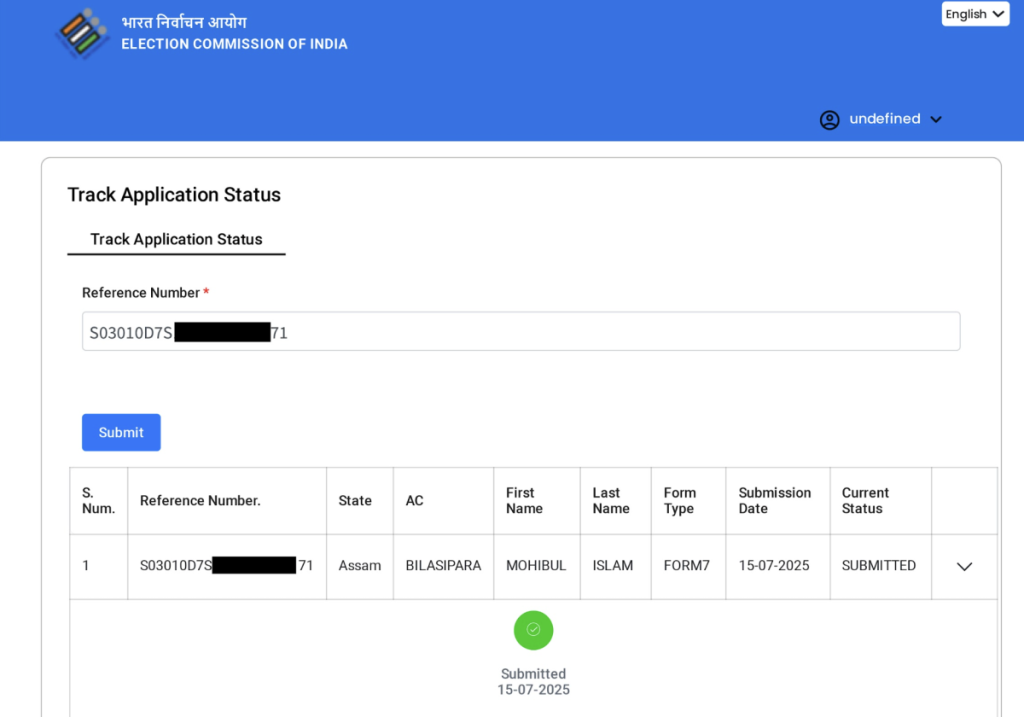 That same evening that Taher Ali got the message, Mohibul Islam, a private school teacher who also lost his home and school in the eviction drive, received a similar message with a different reference ID on the phone number linked to his voter ID. When he tracked the reference number on the ECI portal, he discovered that Form 7 had been submitted in his name as well. Mohibul said, “I was born in this village and never requested to delete my name from the electoral roll. Why would I do that?” he asks.
