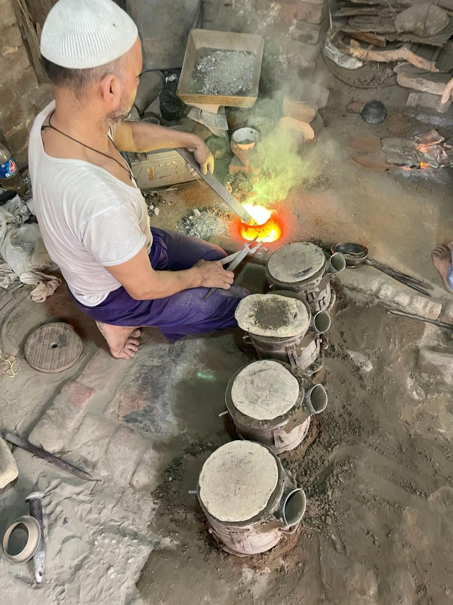 Ashaqeel and Mujeeb-ur-Rahman working next to a furnace to cast the metal into moulds, using silt. Photo: Sabah Gurmat