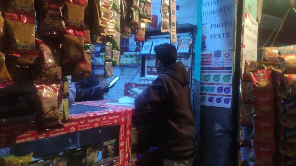 Ashwani Kumar, 38, runs the shop with his sectagenarian father. He sells data plans, print-outs, chips, eggs and cigarettes. The shop, with big red advertisements for Airtel and Vodafone, does not stretch beyond 8-10 square feet. Its walls are painted teal, and a wall-clock featuring BJP leaders, prominently Narendra Modi, faces the customer.