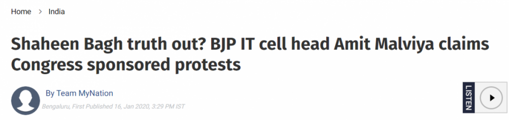 On January 15, Bharatiya Janata Party social media head Amit Malviya tweeted a video of a group of men talking about the Shaheen Bagh protesters. They alleged that women participating in the sit-in protest are being paid to demonstrate against the Citizenship Amendment Act and the proposed National Register of Citizens.
