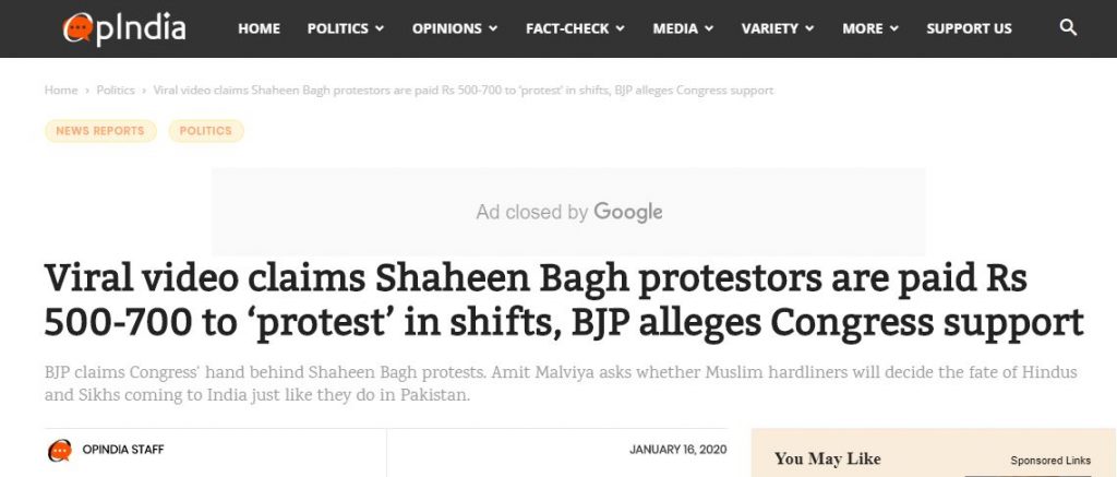 OpIndia, another right-wing propaganda website, picked up the story too and said: “Even though OpIndia could not verify the authenticity of the video, it certainly raises doubts about the credibility of the organised Shaheen Bagh protests.”
