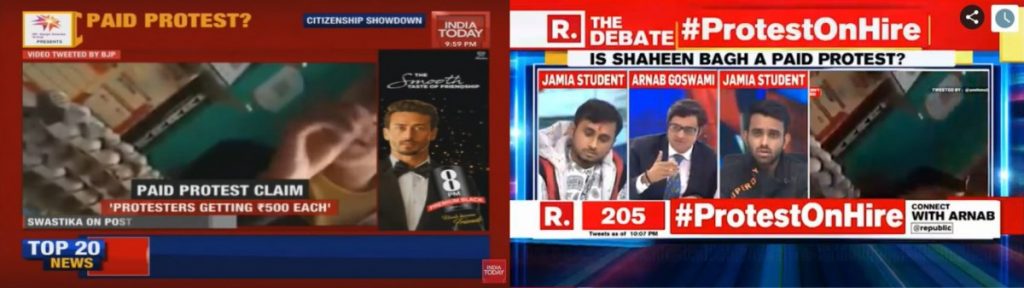 Primetime debates on India Today and Republic TV also focused on Malviya’s video. Republic TV asked “Is Shaheen Bagh a paid protest?” and ran the hashtag #ProtestOnHire.