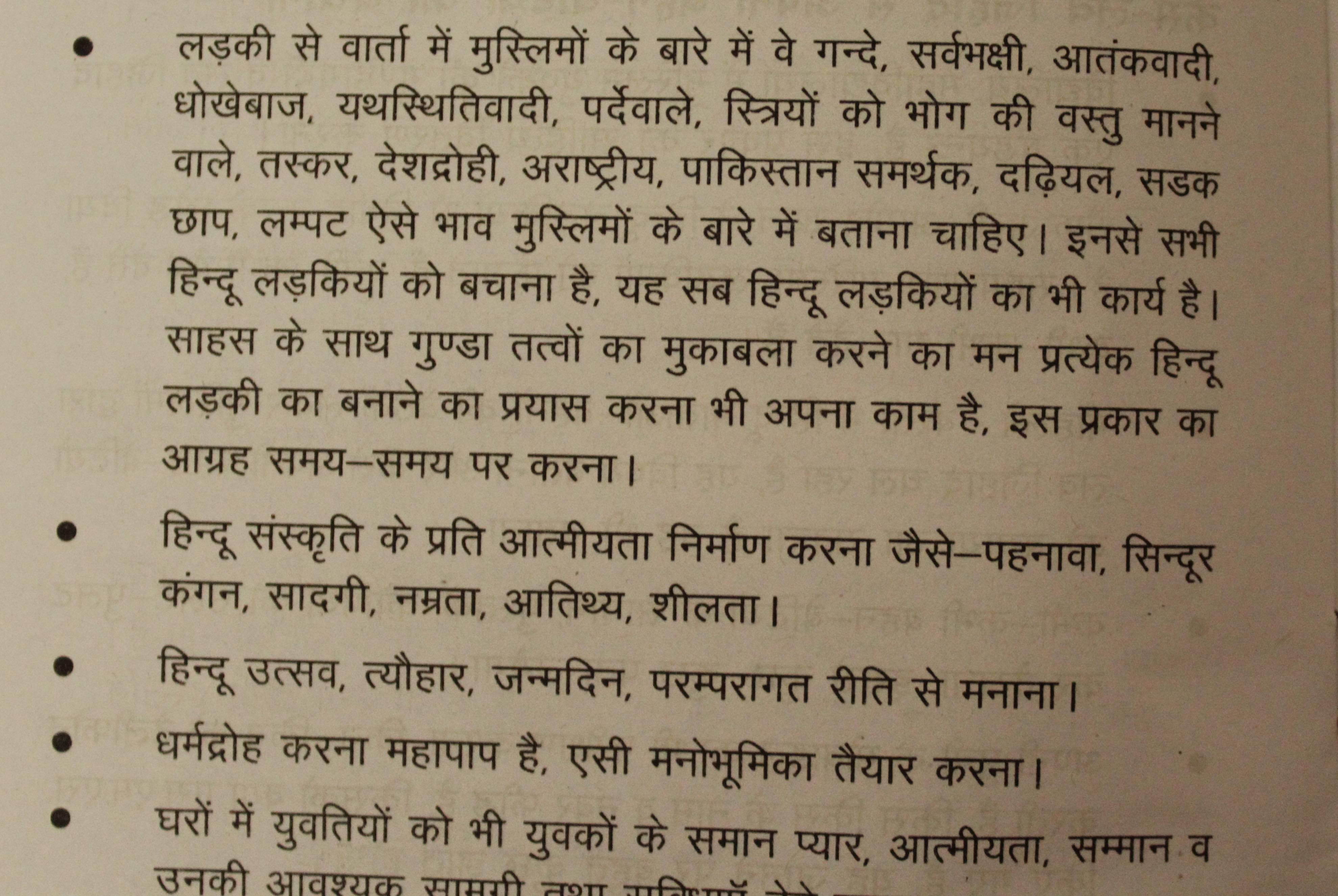 Stating that conversion is a 1,000-year-old practice in Islam, the Bajrang Dal manual details the ways in which Muslim men supposedly trap Hindu women – "friendship in school, bike ride, hanging out in restaurants, chatting on mobile, addressing their parents with respect and blackmailing through obscene pictures". It also prescribes remedies and precautions to the ‘affected’ Hindu family – "frequently check the female’s belongings, call and SMS details, warn the Muslim boy if found with a Hindu girl, call Muslims as disgusting/terrorist/smuggler/traitor/Pakistan supporter in front of females at home".