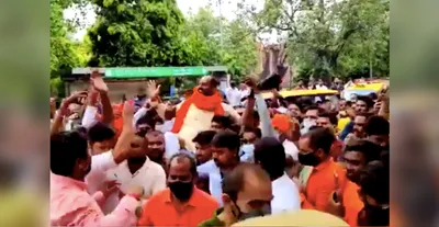 A video tweeted by journalist Prashant Kumar shows a garlanded Pinki Chaudhury, whose real name is Bhupinder Tomar, being carried on the shoulders of men as those around him shouted adulatory cries in his support. The video footage shows that security forces occupy the sidelines as the crowded procession appears to make its way ahead with Tomar.