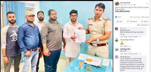 The strategy of using a privately issued ‘memorandum’ to justify intimidation took place again in November, when he posted another picture of himself on Facebook holding up a ‘memorandum’ with a member of the Gurugram police force, informing the administration of a protest they would be taking out against namaz at Gurugram. The idea behind this was that public land was being occupied by Muslims while offering namaz, and would lead to ‘land jihad’ as a result.