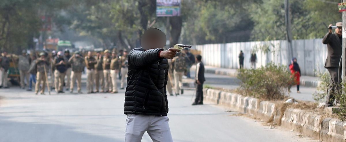 A shooter brandishes a gun outside the Jamia Millia Islamia university in New Delhi, India, January 30, 2020. His face has been blurred as he was a minor at the time. Photo: Reuters/Danish Siddiqui