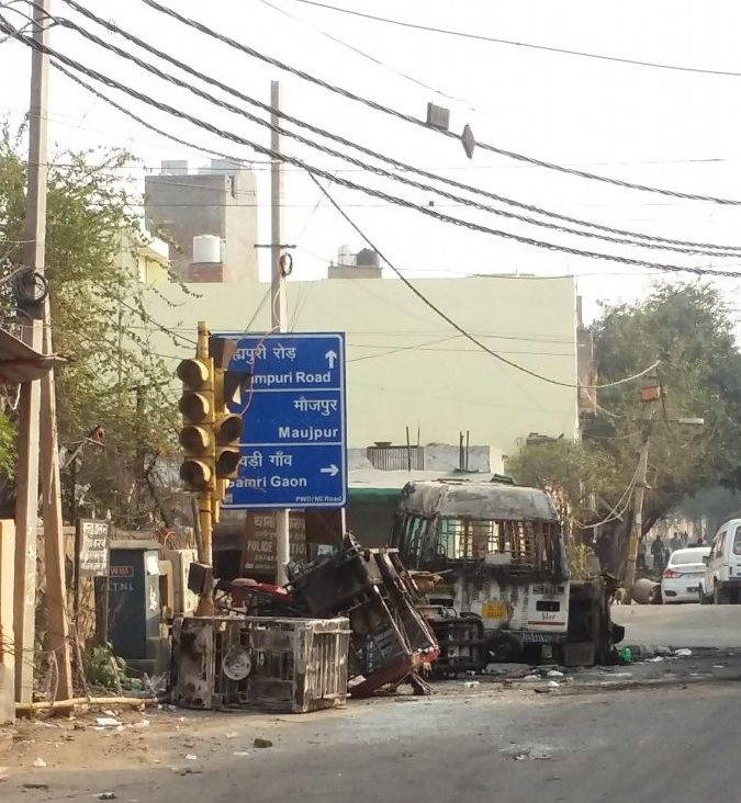 A signboard showing Maujpur in northeast Delhi, during the riots. Photo: The Wire