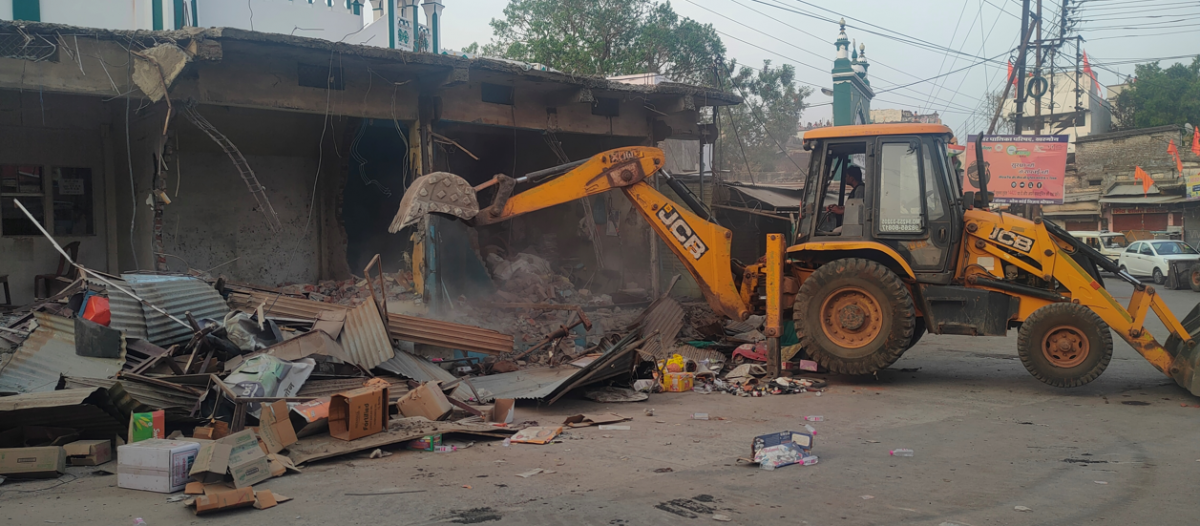 A photo of district authorities demolishing 12 shops belonging to Talab Chowk Masjid committee, a day after the riots in Khargone. Photo: Special arrangement