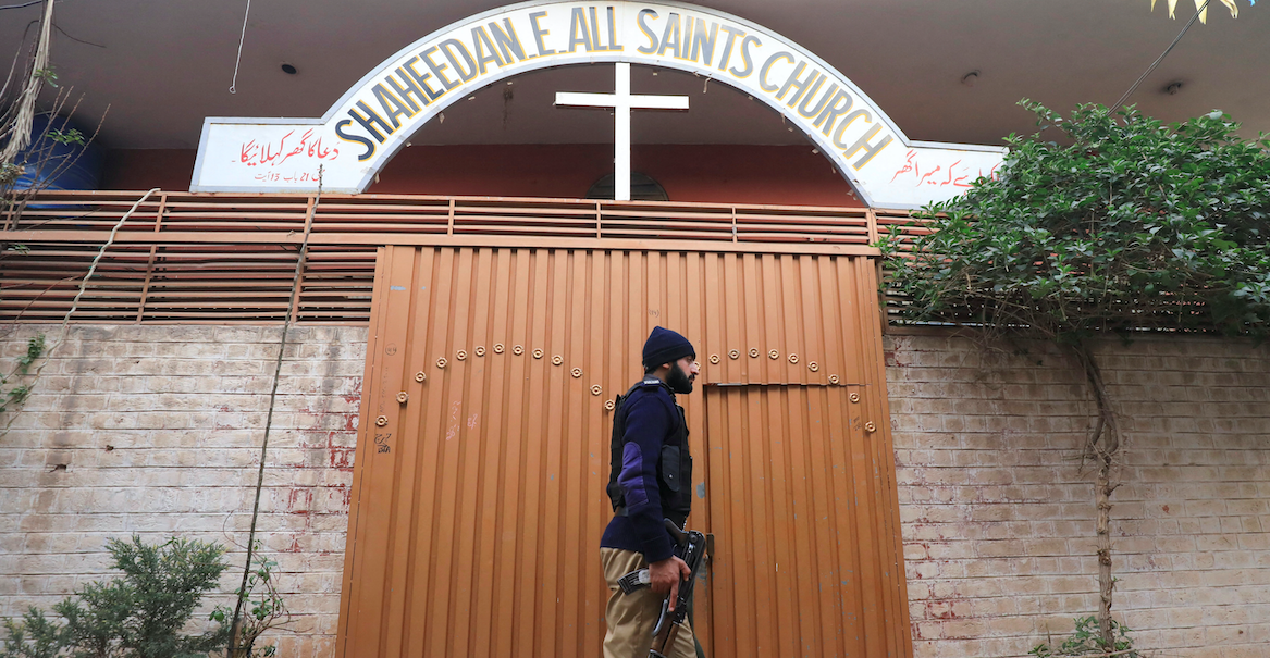 A police officer walks in front of the main entrance of Shaheedan-e-All Saints Church (Martyrs of the All Saints Church) built in memory of people who were killed in twin bomb blasts in All Saints Church in 2013, in Peshawar, Pakistan January 31, 2022. Photo: Reuters/Fayaz Aziz