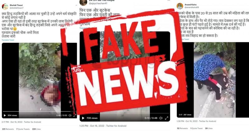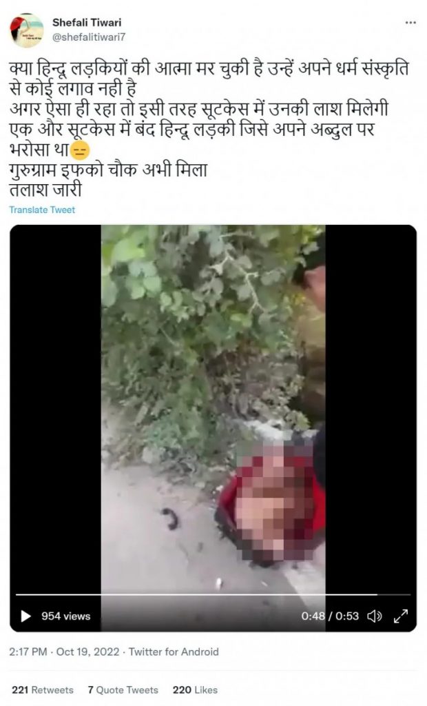 Twitter user @shefalitiwari7 shared the viral clip and wrote, “Are the souls of Hindu girls dead? Don’t they have any attachment to their religion and culture? If it is like this we will continue finding bodies in suitcases such as this. One more Hindu girl was found in a suitcase who had trusted her Abdul. Near Gurugram Iffco Chowk. Search is on .” (Archive.)