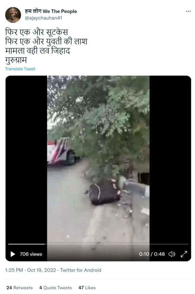 Another Twitter user, @ajaychauhan41, shared the clip and wrote, “Yet another suitcase, yet another girl’s body same old case of love jihad. Gurugram.” (Archive.)