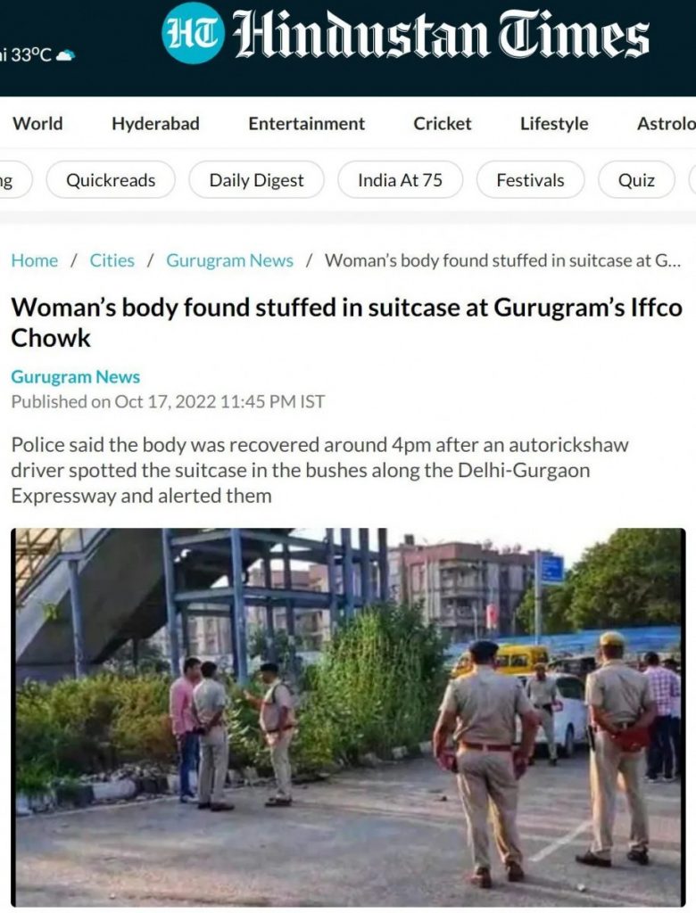 Taking note of the captions, we performed a Google search using relevant keywords and found several news reports related to the discovery of a body near Guruguram’s IFFCO Chowk. On October 17, Hindustan Times reported that the body of a woman was found stuffed in a suitcase at IFFCO Chowk on Monday. It was found around 4 pm after an auto-rickshaw driver spotted the suitcase in the bushes along the Delhi-Gurgaon expressway and alerted the police.