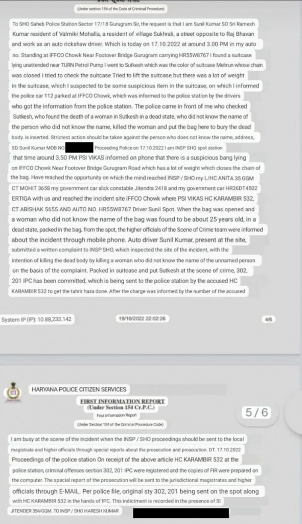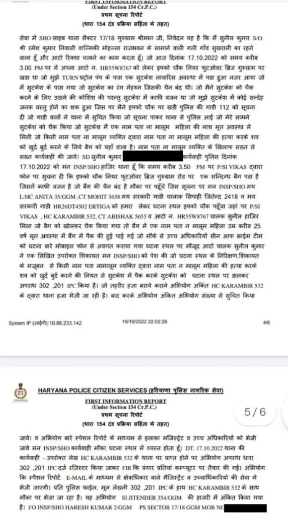 Alt News also accessed a copy of the FIR pertaining to the case. Here, the name of the complainant is Sunil Kumar, the auto-driver who first discovered the suitcase in the bush. Additionally, Alt News spoke with station house officer (SHO) Haresh Kumar under whose supervision the FIR was filed. “To my knowledge, there’s no angle of love jihad. The FIR was indeed filed at my police station but the case was transferred to the CIA branch,” Kumar said.