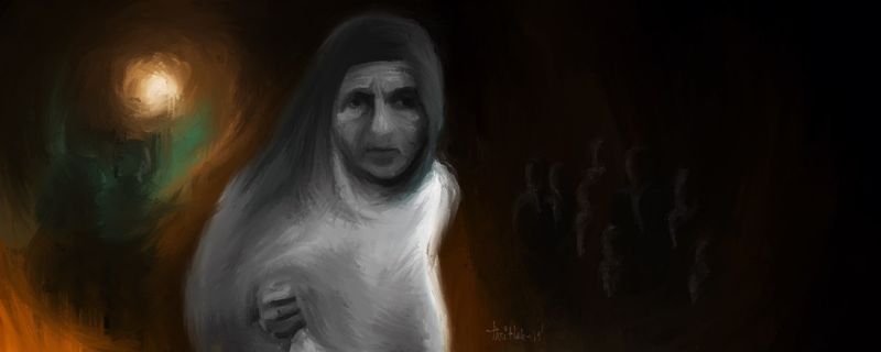 Her darkened, wrinkled face and her pinched, clouded eyes showed no feeling. She just covered her head with her poorly patched chador.