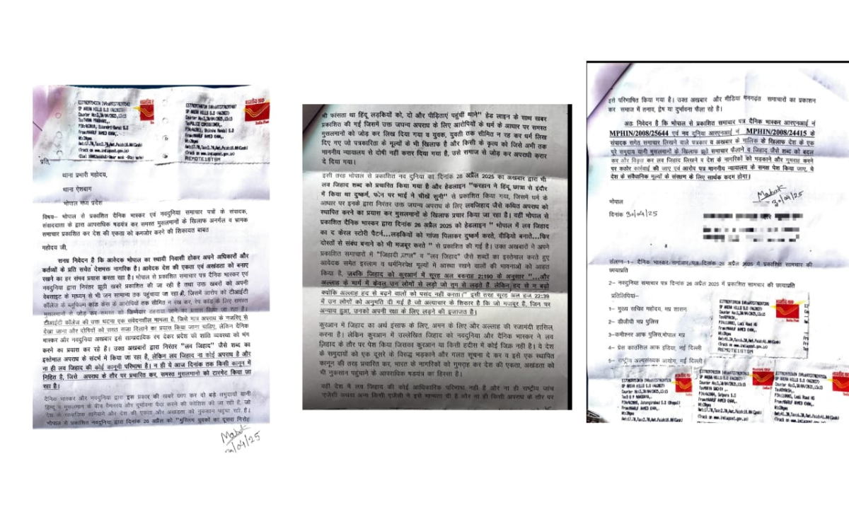 An individual from Bhopal has submitted a written complaint against Hindi dailies Dainik Bhaskar and Nav Duniya for the headlines that allegedly targeted Muslim community. The complaint was formally submitted to the Aishbagh police station in Bhopal and sent to key authorities, including the Press Council of India and the National Commission for Minorities.