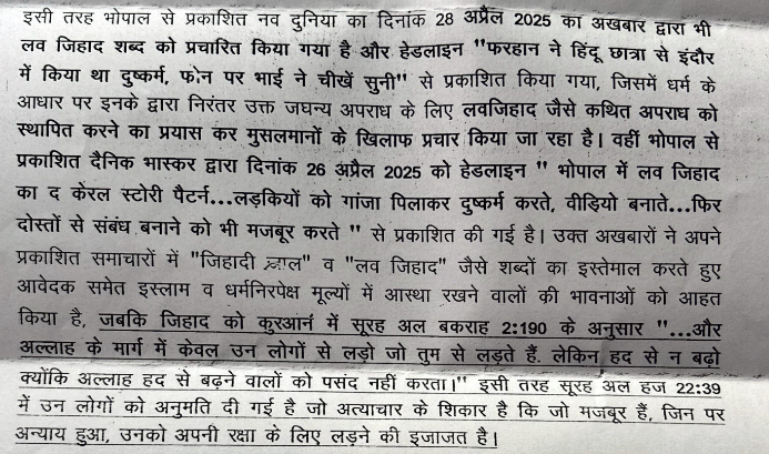 Advocate Deepak Bundele opines that newspapers have distorted the true meaning of jihad as described in the Quran. “In the Quran, jihad refers to justice, peace, and seeking Allah's approval. However, Dainik Nav Dunia and Dainik Bhaskar have misrepresented it as ‘love jihad’, a term that does not appear in the Quran or any Hadith. This misrepresentation spreads false information, fuels communal tension, and wrongly presents it as an established concept. This action misguides the public and undermines national unity. We intend to approach the high court regarding this issue,” he says.