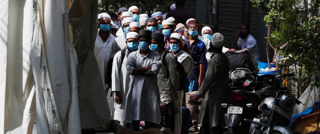 Men wearing protective masks wait for a bus that will take them to a quarantine facility, amid concerns about the spread of coronavirus disease (COVID-19), in Nizamuddin area of New Delhi, March 31, 2020. Photo: Reuters/Adnan Abidi