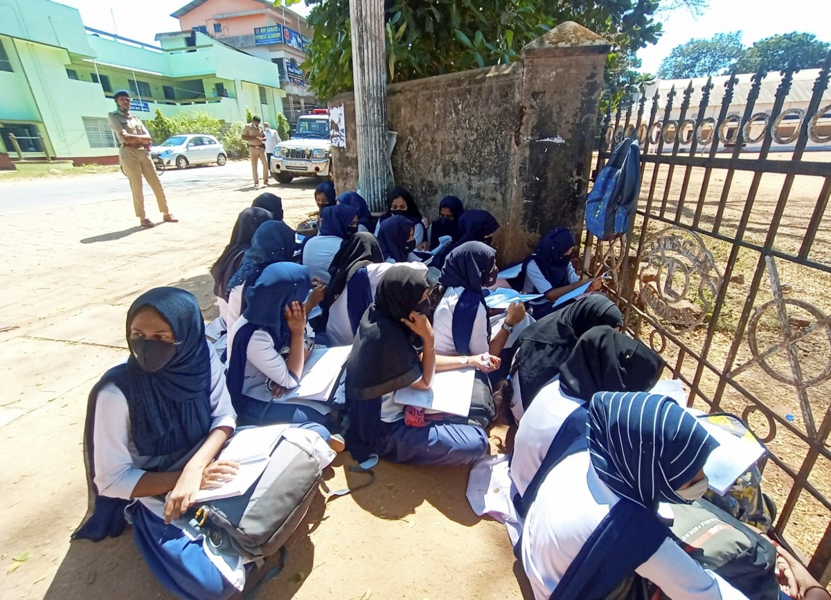 Kundapura: Students wearing hijab sit outside their school as the school authorities denied entry for wearing a hijab or scarf, in Kundapura of Udupi district, February 4, 2022. Photo: PTI.