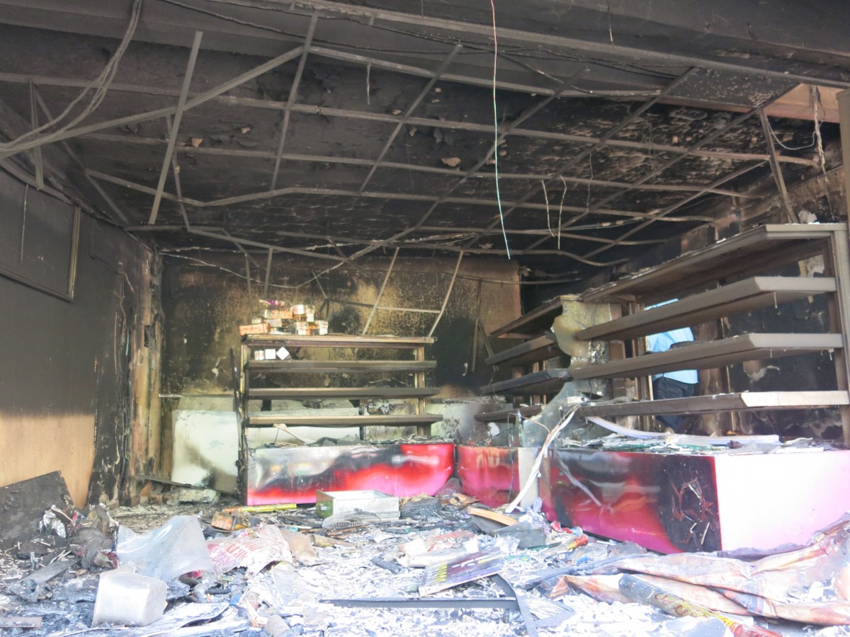 Residents examine charred shops, like this burnt bakery. Photo: Chitrangada Choudhury