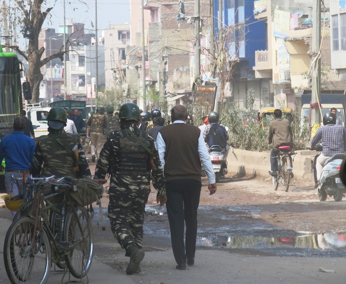 Paramilitary patrol streets in the area’s neighbourhoods on Sunday, March 1. Photo: Chitrangada Choudhary