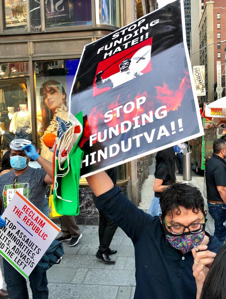 A truck with images of the Babri Masjid on the sides went around Times Square. Protestors meanwhile held up banners with slogans like “Stand Against Hate” and “Join the Struggle Against Fascism”. Mittal said she found it somewhat “surreal” to watch both the celebrations and protests unfold under large images of Mickey and Minny Mouse.
