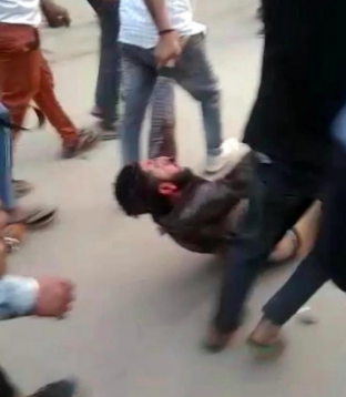 A still from a video of Shahrukh being beaten and dragged on the street by the rioters.