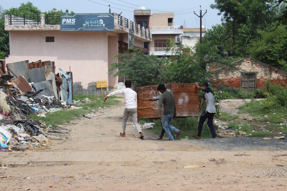 Denting and vehicle repairs kiosk owner Mohd Ali and his brothers scramble to pick up their supplies, amidst bulldozer action in Nuh. Photo: Ayush Tiwari