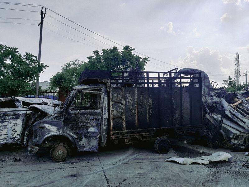 Many vehicles were burnt by the mob during the Nuh riots. Photo: Atul Ashok Howale