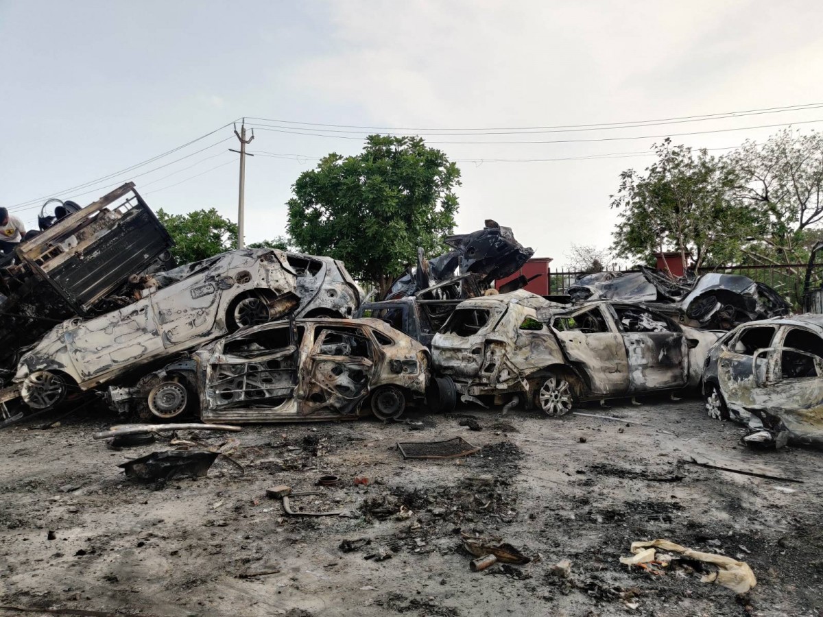 Rampaging groups set ablaze numerous vehicles amidst riots in Nuh.