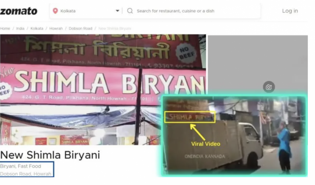 We performed another keyword search on Google based on this information and came across photos of a shop named ‘New Shimla Biryani’ on Zomato located on GT Road in Pilkhana, Howrah.