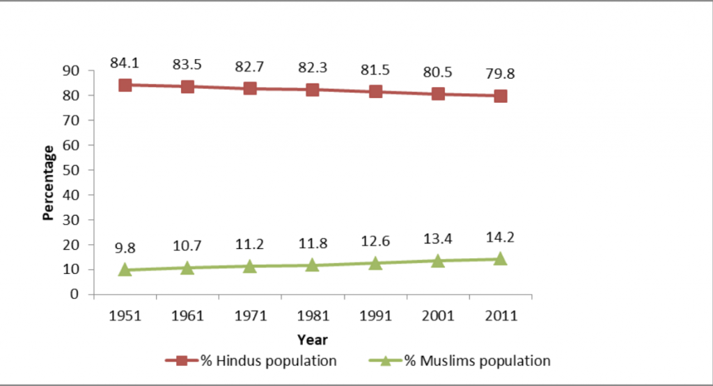 For India, the comprehensive and most accurate data on population measures is collected and published by the Census Office. As per the Census of 2011, the share of the Hindus and Muslim population is about 79.8% (966 million) and 14.2% (172 million) respectively in the year 2011 (see Figure 1 above).