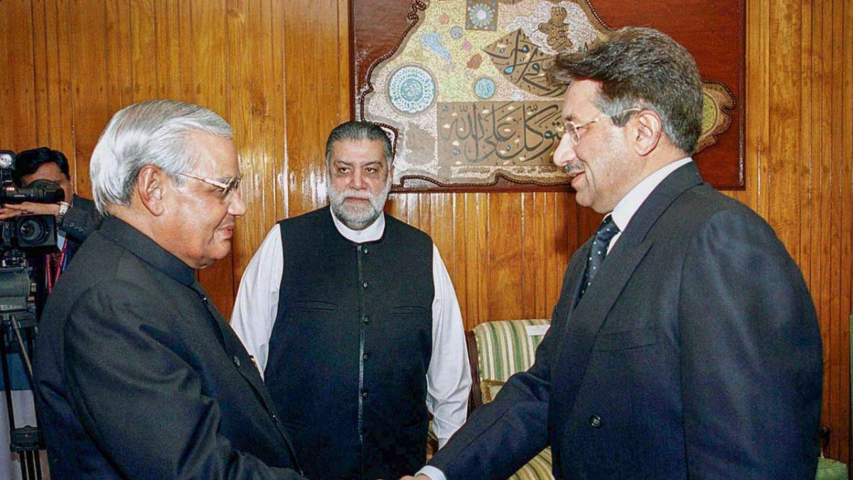 A file image of former Prime Minister, late Atal Bihari Vajpayee, with his Pakistani counterpart Parvez Musharraf. Photo: PTI/File