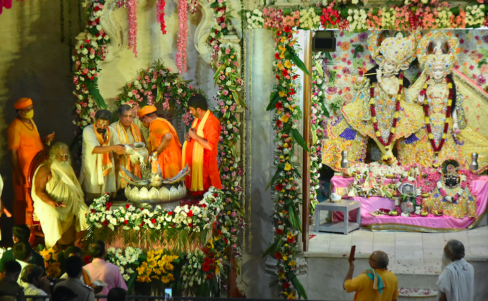 Ram Janmabhoomi trust head Nritya Gopal Das and priests perform 'abhishek' on idols of Lord Krishna and Radha on Janmashtami, at Krishna Janmasthan Temple in Mathura, Wednesday night, Aug. 12, 2020. Photo: PTI