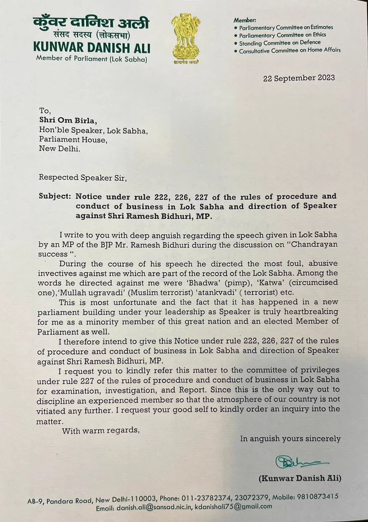 Congress, Dravida Munnetra Kazhagam (DMK), Nationalist Congress Party (NCP), and Trinamool Congress have thrown their weight behind Ali by moving privilege motions against Bidhuri.
