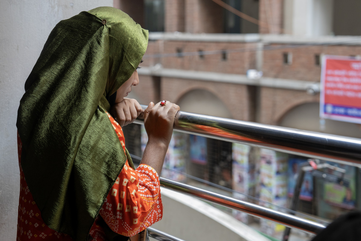 Jakia Begum's daughter wait for Sakina Begum's court hearing at the Chief Judicial Magistrate Court, Dhaka, on November 10, 2025. Photo: Parvez Ahmad Rony