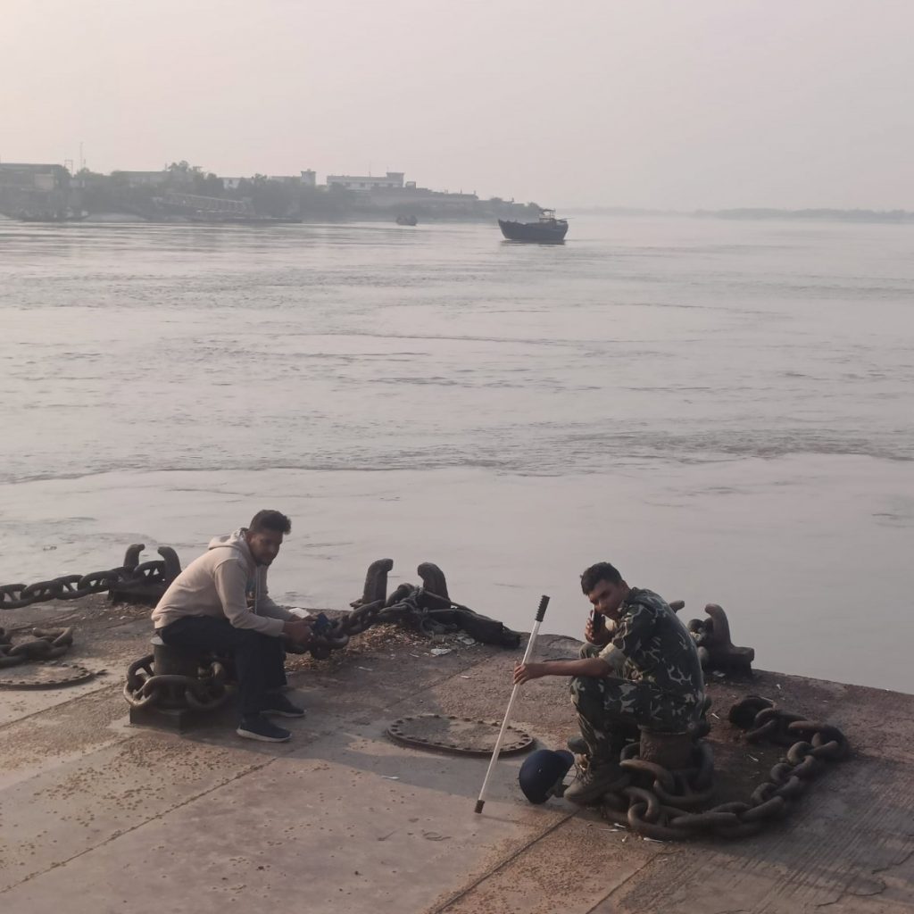 Two men, one in security forces' uniform, sit on a jetty at Sandeshkhali. Photo: Joydeep Sarkar