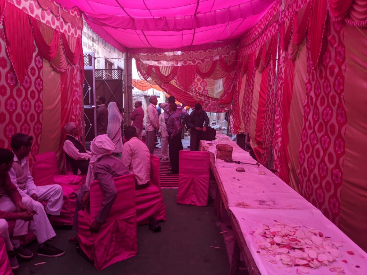 The pink and white shamiana (tent) is lined with chairs, and food is served out of kadhais meant for a feast. A DJ is setting up his sound system. “Iska beta hua hai, aaj naamkaran hai (He’s had a son, this is the function to name him),” an elderly woman tells us, pointing at a man standing in front of us.