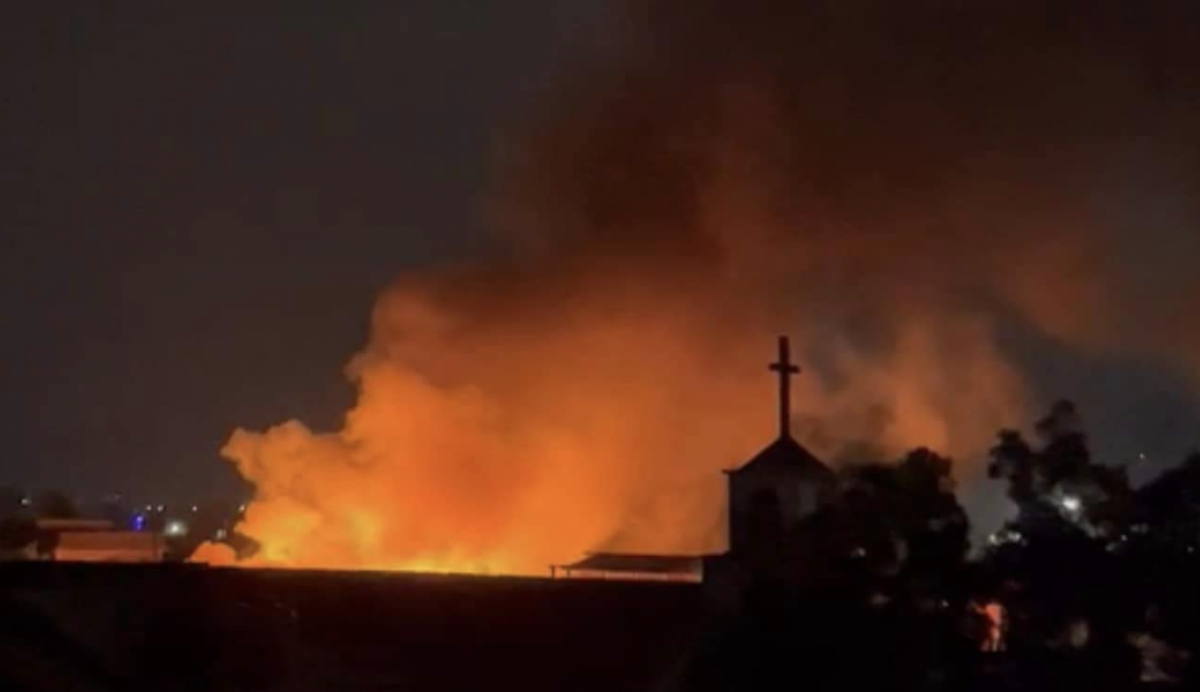 Fire and smoke are seen against a church in Manipur. Photo: Twitter/@MangteC