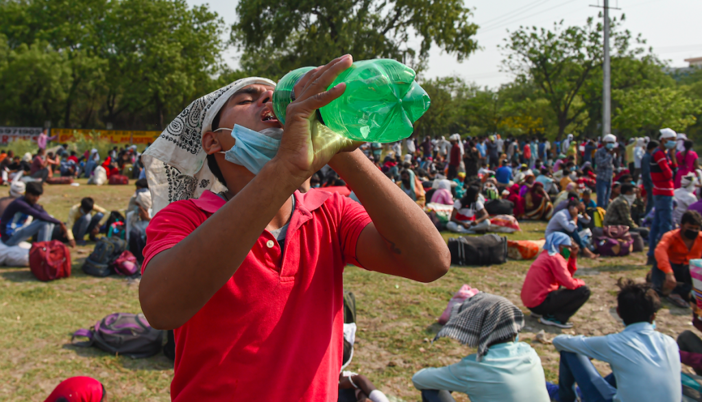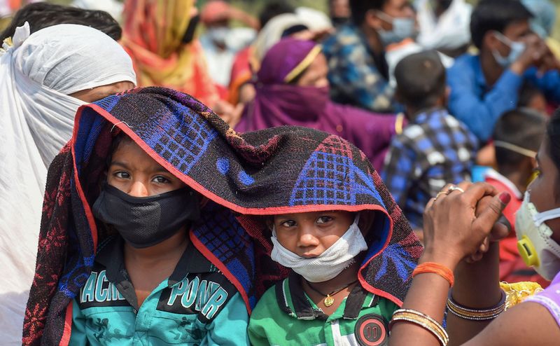 Migrants wait for a means of transport to travel to their native places during the fourth phase of the ongoing COVID-19 nationwide lockdown, at Kundali Industrial Area in Sonipat, Monday, May 18, 2020. Photo: PTI