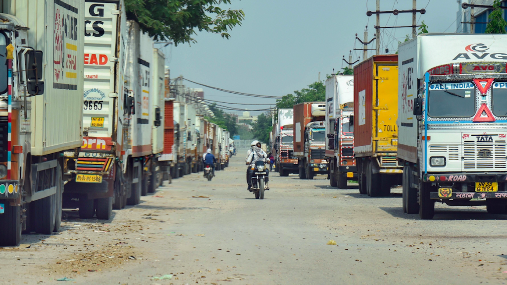 Trucks are parked on either side of a road near Kundali Industrial area, during the fourth phase of the ongoing COVID-19 nationwide lockdown, in Sonipat, Monday, May 18, 2020. Photo: PTI