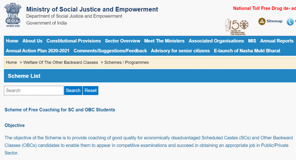 Picture 9: notification of the scheme for free coaching services to SC and OBC students irrespective of religion on the website of Ministry of Social Justice and Empowerment.