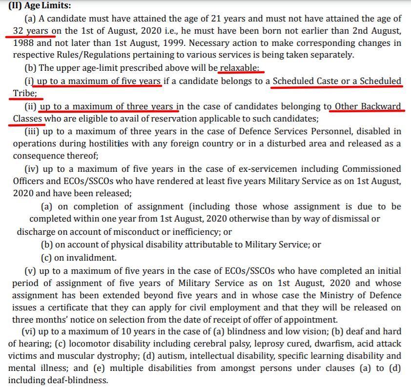 The age limit is also relaxed for other groups such as those in defence services, commissioned officers, people with disabilities, etc. The notification further states, “Candidates belonging to the Scheduled Castes and the Scheduled Tribes and the Other Backward Classes who are also covered under any other clauses of Rule 6(b) above [which provides upper-age limit relaxable for certain categories]” will be eligible for grant of cumulative age relaxation under both the categories.