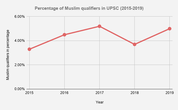 Data from the last five years collated from the UPSC website does not show a ‘sudden’ rise in Muslim qualifiers but the percentage varies between 3% to 5%. Since the recruitment number is not constant every year, the graph below shows the percentage of Muslim candidates out of the total number of qualifiers in 2015-2019.
